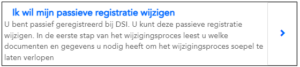 Via jouw account in MijnDSI kun je een wijziging van een passieve registratie aanvragen. Klik hiervoor in MijnDSI op de button Ik wil mijn passieve registratie wijzigen en volg de aanwijzingen in het scherm.