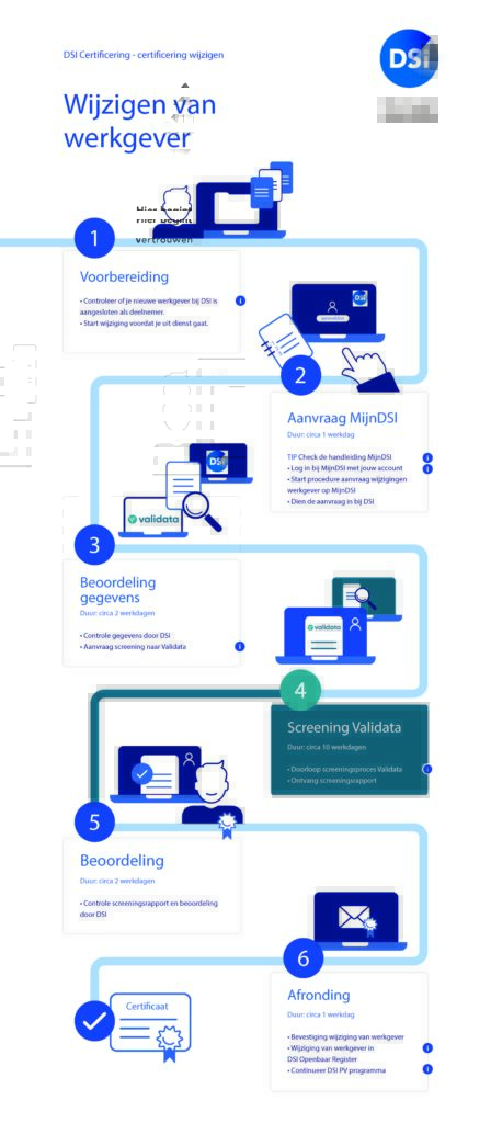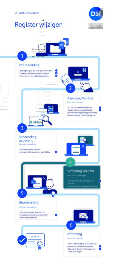 Iedere wijziging of aanvulling met betrekking tot je functie of werkgever heeft effect op je DSI Certificering. Het kan zijn dat je door een functiewijziging moet veranderen van register. Of dat je nieuwe werkgever geen DSI deelnemer is en je daardoor extra handelingen moet gaan uitvoeren om toch gecertificeerd te blijven. Het is belangrijk dat je DSI registratie up-to-date is en dat je wijzigingen altijd zo snel mogelijk aan DSI doorgeeft. Hierdoor hebben we gezamenlijk voldoende gelegenheid om de wijzigingen te controleren en de juistheid van je registratie in het Openbaar Register te garanderen.